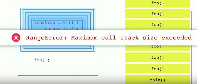 참고로 call stack 은 크기에 제한 사항이 있다. 만약 무한 루프를 걸어서 함수를 끊임없이 계속 호출하여 stack 에 쌓이는 경우, 아래 사진 같은 "Range Error: Maximum call stack size exceeded." 오류를 브라우저에서 보낸다. (크롬의 경우 최대 16,000 프레임이 한도라고 한다)